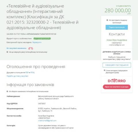 Великолюбінська селищна рада Львівського району оголосила тендер у системі ProZorro на телевізійне й аудіовізуальне обладнання, яке підрядник повинен поставити до 31 грудня 2023 року.