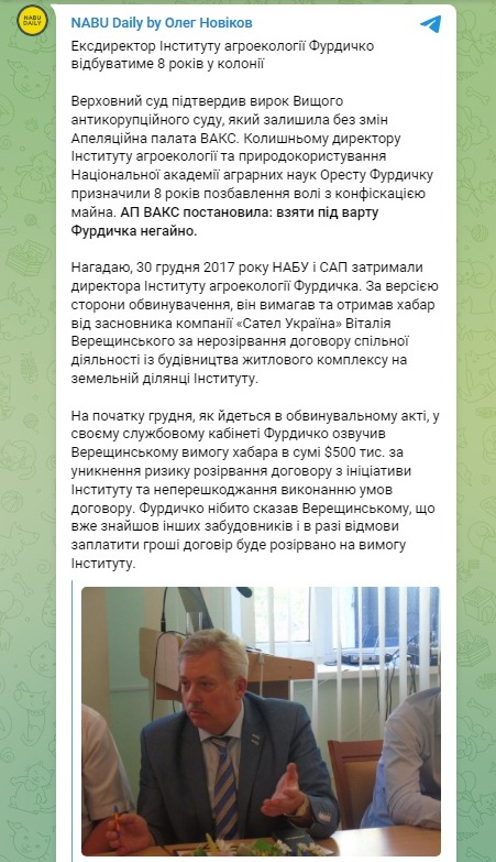 "Верховний суд підтвердив вирок Вищого антикорупційного суду, який залишила без змін Апеляційна палата ВАКС. Колишньому директору Інституту агроекології та природокористування Національної академії аграрних наук Оресту Фурдичку призначили 8 років позбавлення волі з конфіскацією майна. АП ВАКС постановила: взяти під варту Фурдичка негайно" – йдеться у повідомленні.