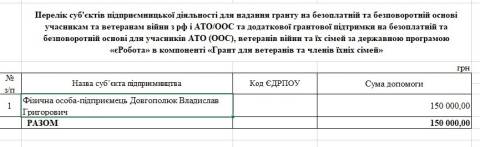 "З метою забезпечення підтримки бізнесу у Львівській області на час дії воєнного стану зобов'язую затвердити рішення експертної комісії в рамках програми "Підтримка підприємницької ініціативи учасників АТО (ООС), ветеранів війни та їхніх сімей" щодо надання гранту на безоплатній та безповоротній основі учасникам та ветеранам війни з рф і АТО/ООС та додаткової грантової підтримки на безоплатній та безповоротній основі для учасників АТО (ООС), ветеранів війни та їх сімей за державною програмою "єРобота" в компоненті "Грант для ветеранів та членів їхніх сімей" в сумі 150 000 гривень" – йдеться у розпорядженні.