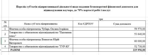 Крім цього, ваучер на підтримку бізнесу ветеранів та членів їх сімей (відшкодування до 70% вартості робіт і послуг) на загальну суму у 225 956 грн отримають: підприємиця Оксана Чубарь – 59 570 грн; ТзОВ "Паломник плюс" – 53 648 грн, підприємець Юрій Вовкогон – 60 000 грн та ТзОВ "ТУР-Ю" – 225 956 грн.