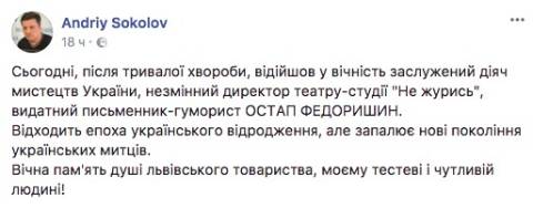 Про це повідомив його родич Андрій Соколов у соціальних мережах.