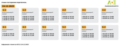 Актуальний графік погодинних відключень на 24.12.2025 для Львівської області (станом на ранок) на фото: