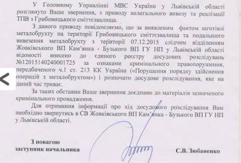 Кримінальне впровадження порушено за ч. 1 ст. 213 Кримінального кодексу "Порушення порядку здійснення операцій з металобрухтом". До матеріалів кримінального впровадження також додані факти, зібрані, волонтерами проекту "Дрон-погляд на зони екологічного лиха Львівщині".