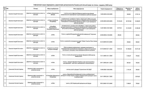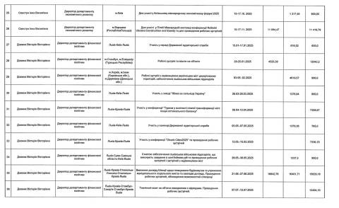 – 25-30 листопада – участь у щорічній конференції POLIS 2025 (м. Утрехт, Нідерланди). Витрати на відрядження – 43 715,23 грн (видатки на проживання – 16 511,97 грн, видатки на проїзд – 16 775,92 грн, добові – 10 427,34 грн).