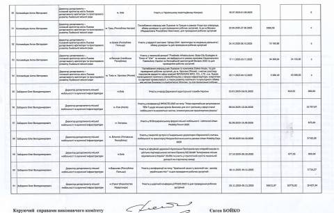 – 27-29 жовтня – участь в офіційній церемонії підписання протоколів про співробітництво із шістьма партнерськими містами Проєкту GIZ GmbH "Інтегроване міське відновлення в Україні" (Київ). Витрати на відрядження – 1 577,55 грн (видатки на проживання – 0 грн, видатки на проїзд – 977,55 грн, добові – 600 грн);