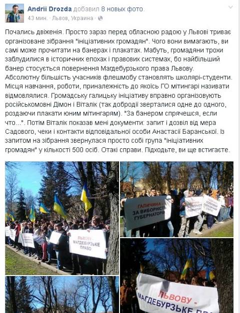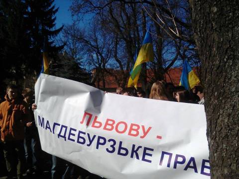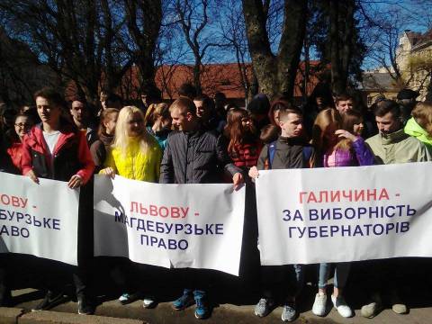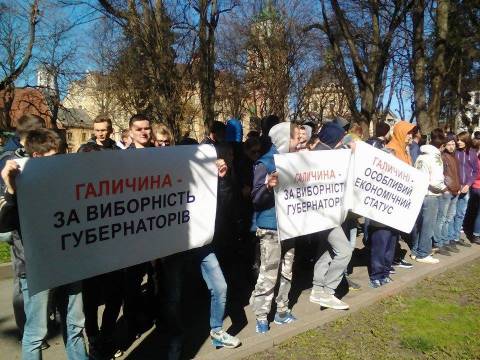 Ініціативні громадяни, переважно студенти, тримають банери з написами: "Галичина за виборність губернаторів", "Львову – Магдебурзьке право", "Львів – європейське місто", "Галичині економічний розвиток", "Галичині – особливий економічний статус" тощо.