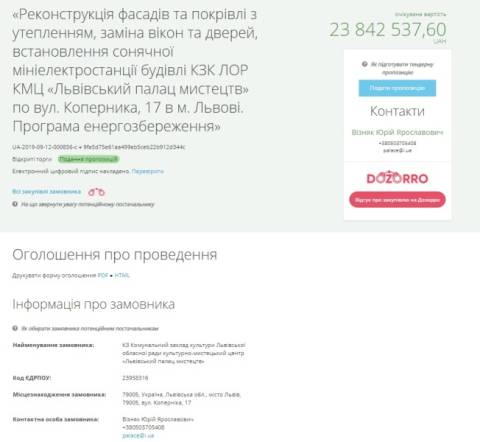 Львівський палац мистецтв замовив за 23 млн грн реконструкцію будівлі та встановлення сонячної мініелектростанції.