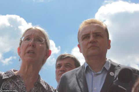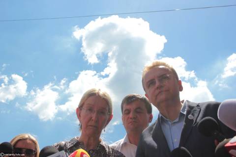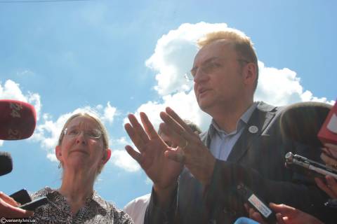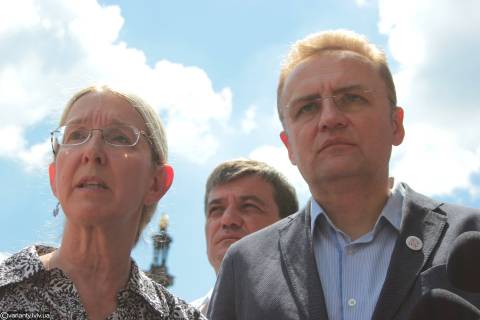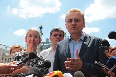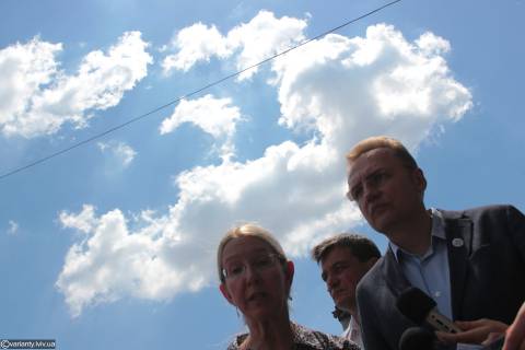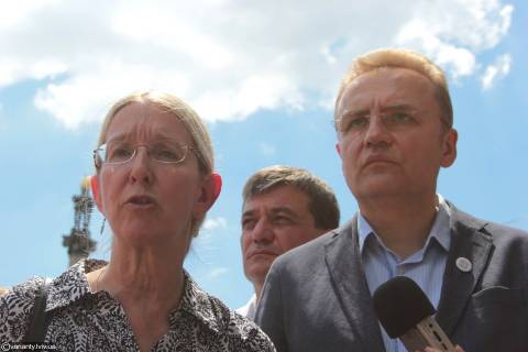 Напроти Садового, під колишнім офісом Правого сектору та під теперішнім штабом ярошевої ініціативи, стоїть Білосніжка Яроша – координаторка його штабу Олена Живко, уся така в дольчах та габбанах. Стоїть собі і сміється, себто насміхається з Садового, бо точно знає, що такими блокадними візитками можна лякати лише маляток та вату. Міфотворець зустрів міфотворця і впізнав побратимську душу.