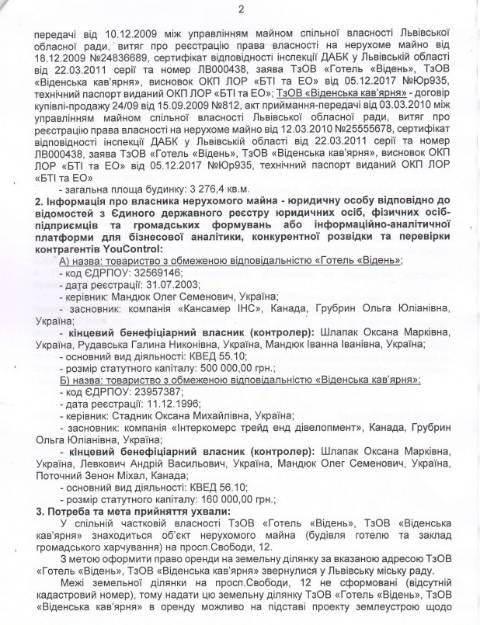 Щодо ТзОВ "Готель "Відень", то Олег Мандюк є керівником цієї фірми, а компанія належить львів'янці Іванні Мандюк.