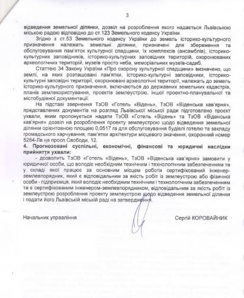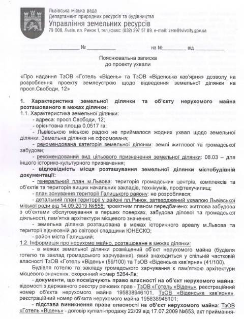 На сайті Львівської міськради оприлюднили проєкт ухвали про надання ТзОВ "Готель "Відень" та ТзОВ "Віденська кав’ярня" дозволу на розроблення проєкту землеустрою щодо відведення земельної ділянки на проспекті Свободи, 12.