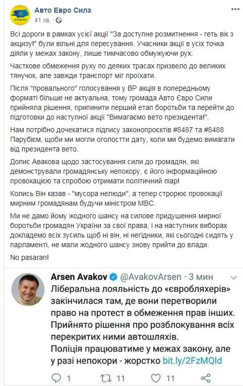 "Після "провального" голосування у ВР акція в попередньому форматі більше не актуальна, тому громада "Авто Євро Сили" прийняла рішення припинити перший етап боротьби та перейти до підготовки до наступної акції "Вимагаємо вето президента!", – йдеться у повідомленні.