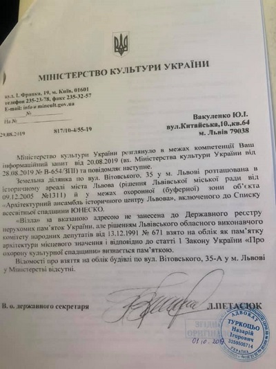 Як доказ позивач ПП "Кас Консалтинг" надав лист від Міністерства культури, який не надає точної відповіді на питання, чи є вілла Бачевського пам'яткою архітектури.