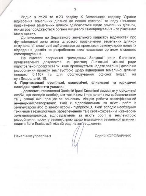 "Надати громадянці Залізній Ірині Євгенівні дозвіл на розроблення проекту землеустрою щодо відведення земельної ділянки орієнтовною площею 0,1108 га на вул. Джерельній, 18 для обслуговування офісної будівлі за рахунок земель промисловості, транспорту, електронних комунікацій, енергетики, оборони та іншого призначення з подальшим переведенням їх до земель житлової та громадської забудови" – йдеться у тексті ухвали.