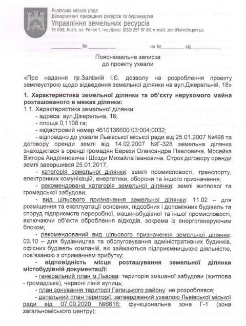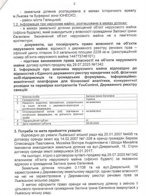 Згідно з документом, йдеться про земельну ділянку площею 0,1 108 га на вул. Джерельній, 18 у Галицькому районі Львова, що перебуває у комунальній власності Львова. На цій ділянці знаходиться офісна будівля – колишній візовий центр площею 2228 м², що з липня 2025 року є у приватній власності Ірини Залізної.