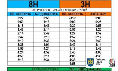 «Нічні трамваї курсуватимуть із інтервалом біля 30 хвилин. Ми уже розробили розклади руху цих трамваїв і розповсюдимо їх через ЗМІ, щоб люди знали, коли відправлятимуться ці трамваї», – наголосив в.о. начальника служби диспетчеризації та організації руху Володимир Забавський.