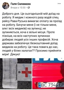 Зазначимо, у спільноті "Варта-1" написала лікарка львів'янка Галина Саламаха, що водії маршруток ігнорують та не хочуть підвозити на роботу медичних працівників. При цьому вони вимагають оплати за проїзд, хоча зараз держава забезпечує безкоштовний доїзд медиків на роботу.