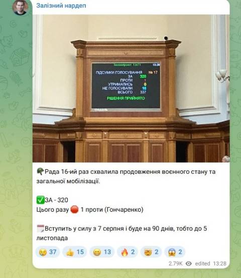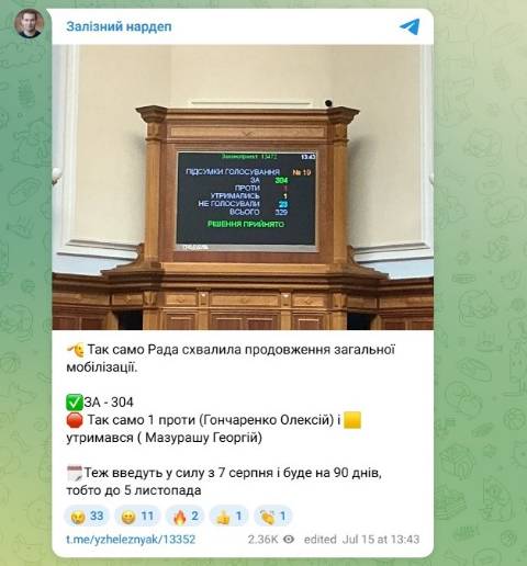 "Рада 16-й раз схвалила продовження воєнного стану та загальної мобілізації. Закон вступить у силу з 7 серпня і буде на 90 днів, тобто до 5 листопада" – написав Ярослав Железняк.