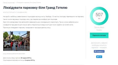 20 червня на порталі е-петицій Петро Волинський зареєстрував петицію з вимогою ліквідувати парковку біля Гранд Готелю.