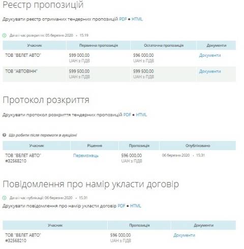 Аукціон стартував 5 березня, участь у ньому взяли ТОВ "Велет Авто" та ТОВ "Автовінн", які запропонували надати авто за 596 000 грн і 599 500 грн відповідно. Переможцем обрали ТОВ "Велет Авто", а очікувана вартість послуг становила 599 500 грн.