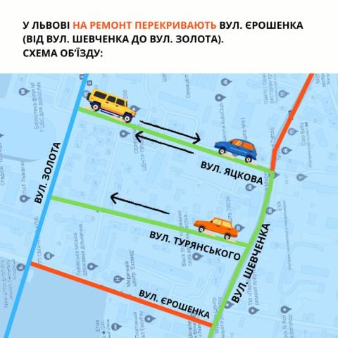 Нагадаємо, з 5 травня вул. Турянського стала односторонньою в напрямку до вул. Золотої. Відтак, об'їзд ділянки ремонту вул. Шевченка від вул. Турянського до вул. Ярослава Мудрого в напрямку до центру міста здійснюється або вул. Турянського – вул. Золота, або вул. Юнаківа – вул. Бортнянського – вул. Братів Міхновських.