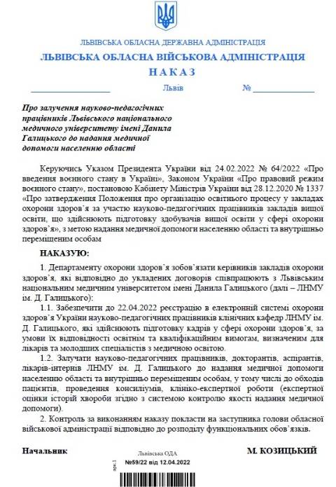 Голова Львівської ОВА Максим Козицький розпорядився залучити викладачів Львівського національного медичного університету імені Данила Галицького залучити до надання медичної допомоги населенню області та внутрішньо переміщеним особам.