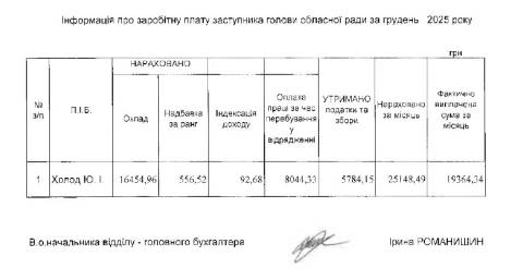 У грудні 2025 року заступнику голови Львівської обласної ради Юрію Холоду нарахували 25 148,49 грн заробітної плати. Зокрема, у цю суму увійшли такі виплати: