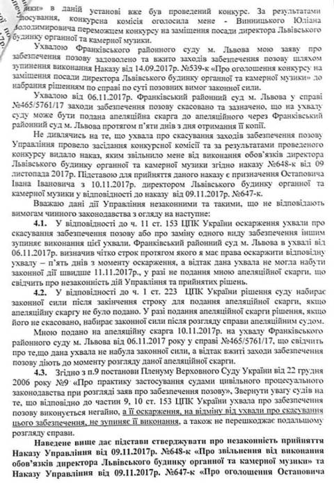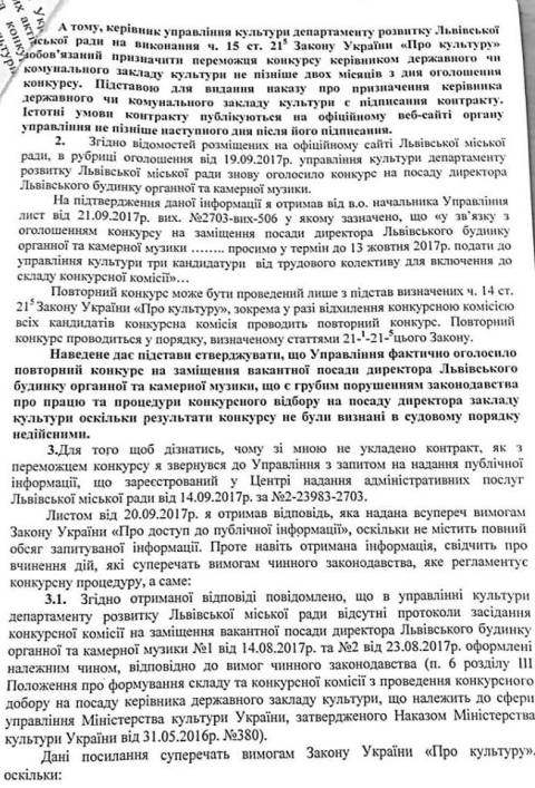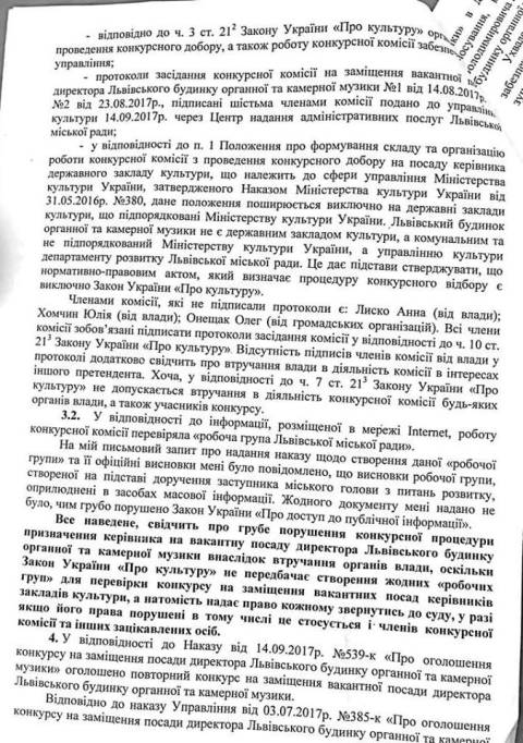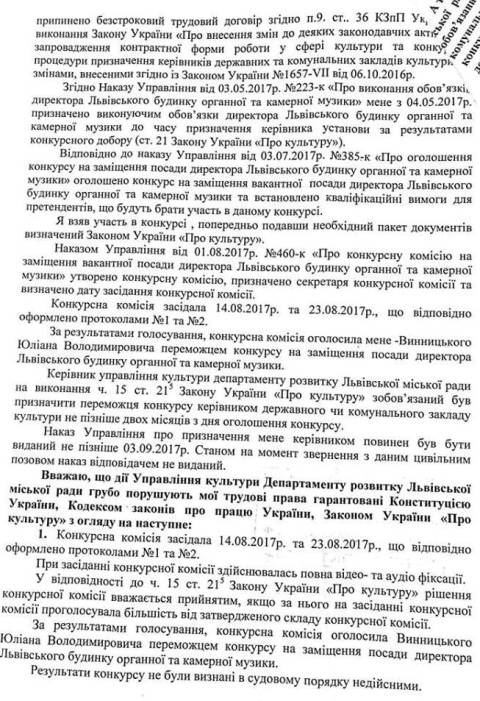 "Все наведене, свідчить про грубе порушення конкурсної процедури внаслідок втручання органів влади, оскільки Закон України "Про культуру" не передбачає створення жодних "робочих груп" для перевірки конкурсу на заміщення вакантних посад керівників закладів культури, а натомість надає право кожному звернутись до суду, у разі якщо його права порушені в тому числі цс стосується і членів конкурсної комісії та інших зацікавлених осіб", –додав Юліан Винницький.