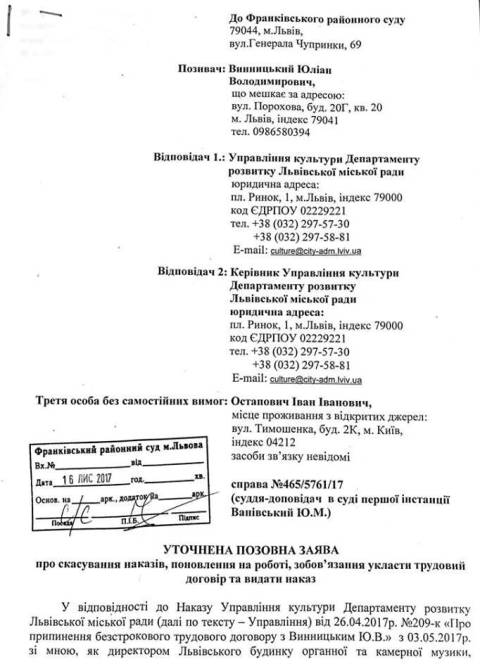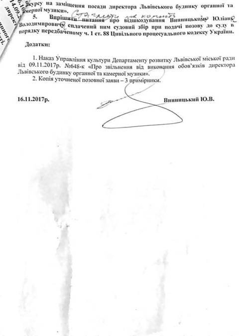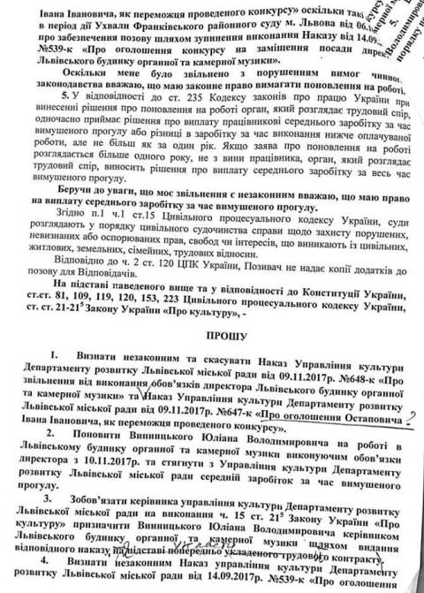 Натомість Юліан Винницький вважає, що конкурс був дійсним, відтак він просить у суду визнати незаконним та скасувати наказ управління культури про його звільнення та оголошення Остаповича переможцем проведеного конкурсу.