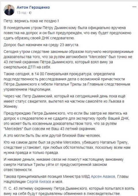 "Слідство отримало неспростовні докази того, що за кермом автомобіля "Мерседес" був точно не 43-річний охоронець Петра Димінського, який взяв вину за смертельне ДТП на себе. Генеральна прокуратура визначила підслідність розслідування справи про можливу причетність Димінського до загибелі Наталії Тріль за Головним слідчим управління Нацполіції. Через годину Петро Димінський, який поки ще має статус свідка, вилетів на приватному літаку зі Львова до Женеви", – написав Антон Геращенко.