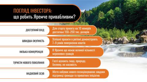 Окремий драйвер – це оздоровчий потенціал. Завдяки унікальному клімату з м’якою вологістю, чистим повітрям і хвойним середовищем, Яремче повертає свою привабливість з початку 20-го століття, а саме як найкраща локація в Східній Європі для оздоровлення і відпочинку людей із респіраторними хворобами, алергією, астмою. А після пандемії COVID-19 та зростання хронічних захворювань ця потреба тільки зросла.