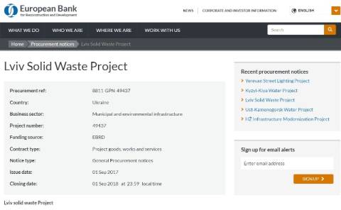 1 вересня ЄБРР очолосив конкурс на реалізацію проекту із рекультивації Грибовицького сміттєзвалища та будівництва сміттєпереробного заводу у Львові.