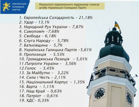 Згідно іх результатами, найбільше голосів набрали такі партії: Європейська Солідарність – 21,18%, Удар – 13,1%, Народний Рух України – 7,87%, Самопоміч – 7,68%, ВО Свобода – 6,18%, Слуга Народу – 5,78%, ВО Батьківщина – 5,7%, Українська Галицька Партія – 5,61%, Пропозиція – 5,53%, Громадянська позиція – 5,01%.