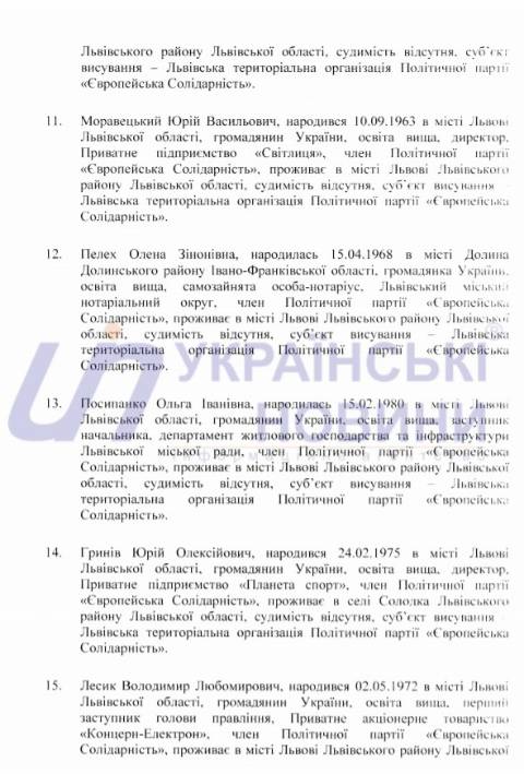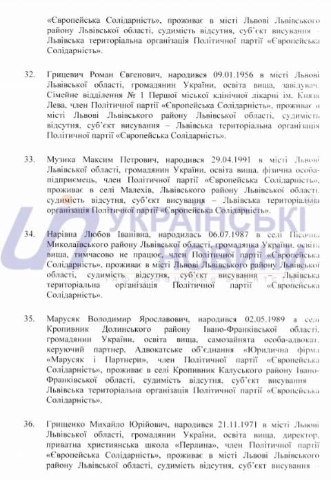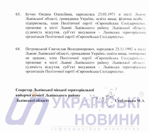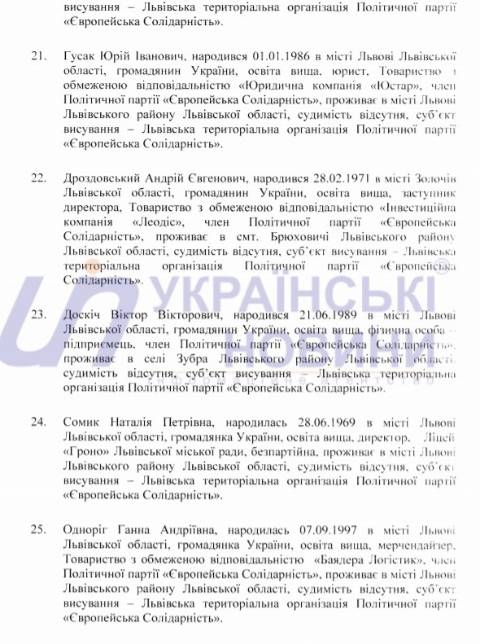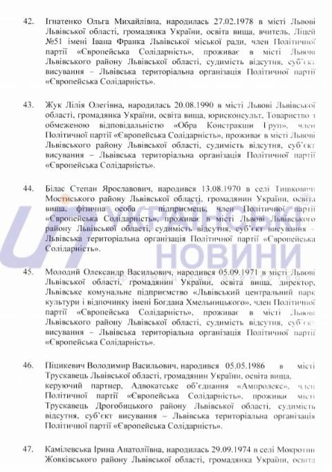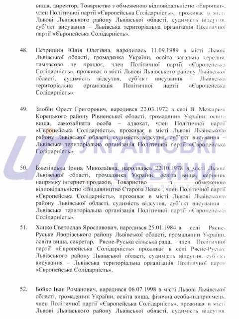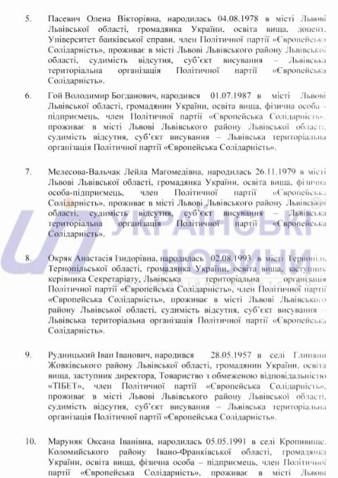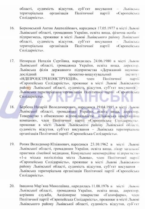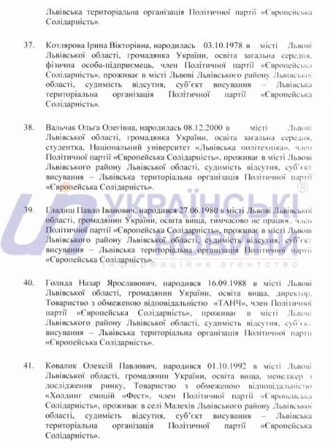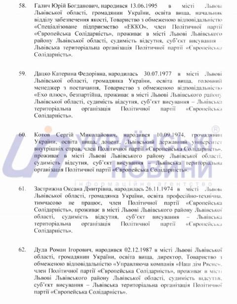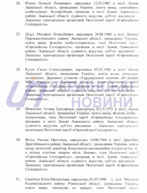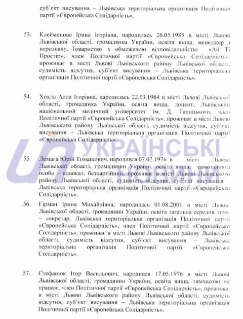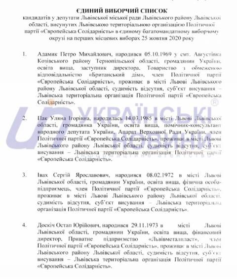 Львівська міська територіальна виборча комісія оприлюднила список кандидатів у депутати Львівської міської ради від політичної партії "Європейська Солідарність", які братимуть участь у виборах 25 жовтня 2020 року.