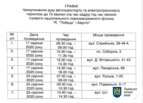 З 17 до 27 серпня у Львові триватимуть зйомки ігрового національного повнометражного фільму "Я, "Побєда" і Берлін". У зв’язку з цим можливі ситуативні затримки в русі електротранспорту, терміном до 10 хвилин, на час зйомок кадру фільму.