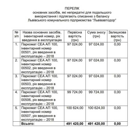 З балансу комунального підприємства хочуть списати шість паркоматів загальною вартістю 491 420 грн. Паркомати ввели в експлуатацію у 20189 році, первісна вартість п'яти з них становить 97 024 грн, а ще одного – 100 624 грн.