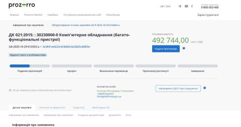 Управління з питань цифрового розвитку Львівської ОВА оголосило тендер у системі ProZorro на закупівлю комп'ютерного обладнання (багатофункціональних пристроїв), які переможець тендеру має доставити до 20 грудня 2025 року.