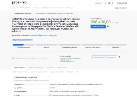 Як йдеться у закупівлі, переможець тендеру має надавати послуги з технічної підтримки системи Megapolis.DocNet в Львівській ОВА та територіальних громадах Львівської області.