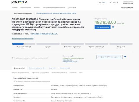 Управління з питань цифрового розвитку Львівської ОВА оголосило тендер у системі ProZorro на послуги, пов’язані з базами даних системи електронного документообігу Megapolis.DocNet у Львівській ОВА, які переможець тендеру має надавати до 20 грудня 2026 року.