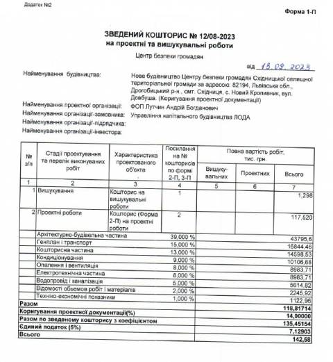 Згідно з закупівлею, підрядник повинен скоригувати проєктно-кошторисну документацію з об'єкта – "Нове будівництво Центру безпеки громадян Східницької селищної територіальної громади за адресою: 82194, Львівська обл., Дрогобицький р-н., смт Східниця, с. Новий Кропивник, вул. Довбуша".