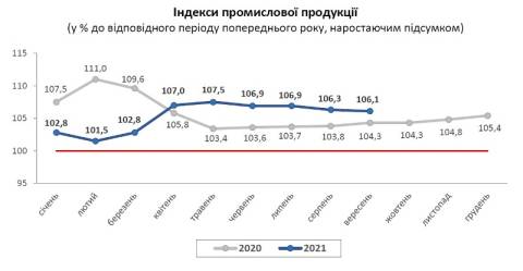 У січні-вересні, порівняно з цими місяцями 2020 року, виробництво промислової продукції в області збільшилось на 6,1%.