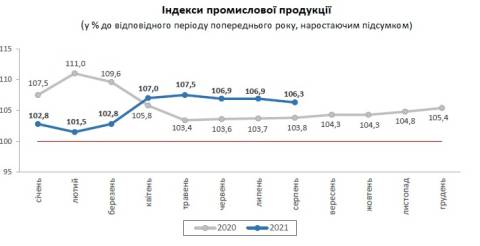 У січні-серпні, порівняно з цими місяцями 2020 року, виробництво промислової продукції в області збільшилось на 6,3%.
