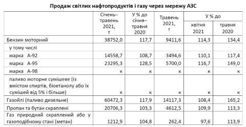 Роздрібний продаж палива дизельного становив 47,1 тис.т, що на 12% більше, ніж за ці місяці у 2020 році, бензину моторного – 35,3 тис.т (на 18,8% більше), пропану і бутану скраплених – 19,7 тис.т (на 2,5% більше).