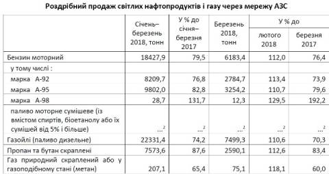 Зокрема, дизельного палива продали 22,3 тис.т, що на 25,8% менше, ніж у січні-березні 2017 року, бензину – 18,4 тис.т (на 20,5% менше), пропану і бутану скраплених – 7,6 тис.т (на 12,4% менше).