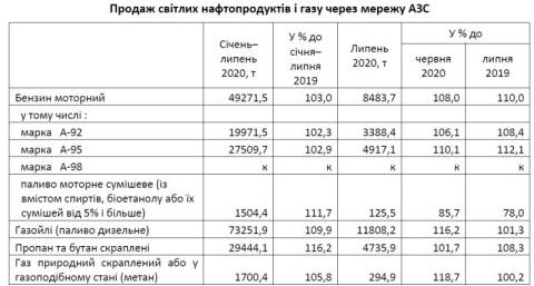 Роздрібний продаж палива дизельного становив 59,1 тис.т, що на 7,2% більше, ніж у ці місяці 2019 року, бензину моторного – 44,2 тис.т (на 0,2% менше), пропану і бутану скраплених – 28,2 тис.т (на 15,7% більше).