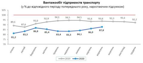 Вантажооборот підприємств транспорту становив 6972,7 млн.ткм і, порівняно з цими місяцями 2019 року, зменшився на 12,2%.