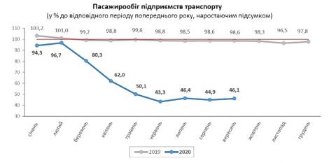 У січні-вересні послугами пасажирського транспорту скористалися 98,4 млн пасажирів, що на 43,2% менше, порівняно з цими місяцями 2019 року.