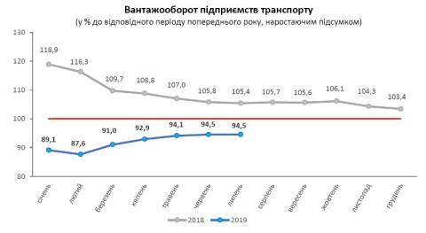 Вантажооборот підприємств транспорту у січні-липні становив 6189,4 млн.ткм і, порівняно з цими місяцями 2018 року, зменшився на 5,5%.