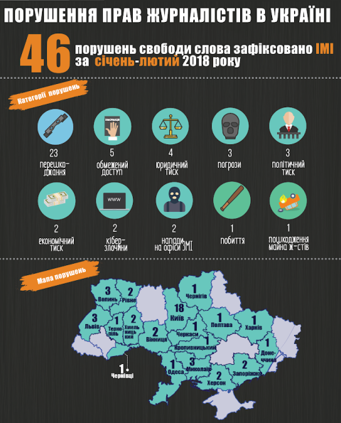 Згідно з результатами щомісячного моніторингу Інституту масової інформації "Барометр свободи слова", за два місяці цього року в Україні зафіксували 46 випадків порушень прав журналістів і свободи слова, що на 10 більше, ніж у січні-люьому 2017 року.
