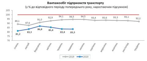 Вантажооборот підприємств транспорту становив 4398,6 млн.ткм і, порівняно з цими місяцями 2019 року, зменшився на 16,7%.