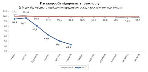 Зокрема, залізниця відправила 1,9 млн пасажирів, що на 65% менше, а послугами автомобільного транспорту скористалися 30,3 млн пасажирів, що на 51,2% менше.